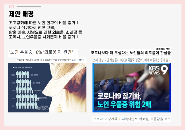 초고령화 사회에 접어들면서 노인 인구의 비율이 증가 하고 있는 상황에서 코로나 장기화로 인한 고립, 황혼 이혼, 사별로 인한 외로움 소외감 등 여러 요인 들로 인해 고독사, 노인 우울증을 겪는 중, 노년층의 비율이 증가 함에 따라 황혼 인연 매칭 서비스 임자야를 제안하였다.