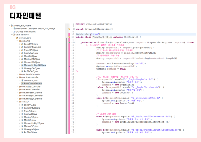 디자인 패턴으로는 프론트 컨트롤러 패턴을 사용하였다.