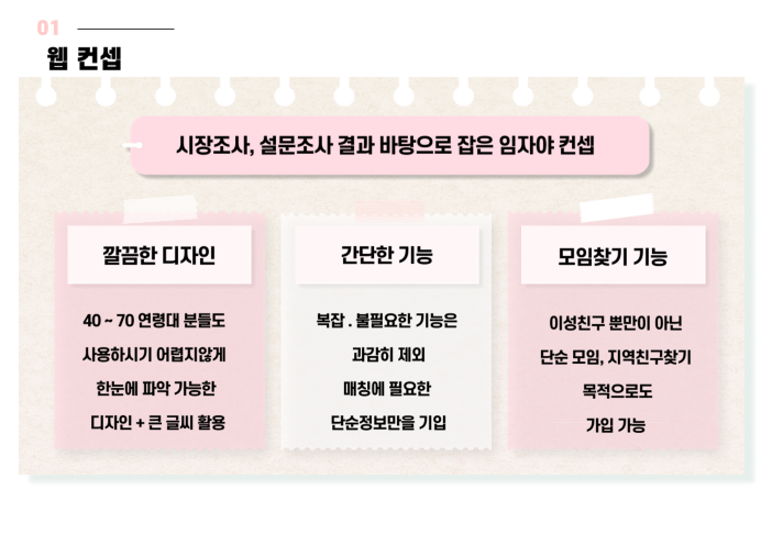 시장조사와 설문조사 결과를 바탕으로 저희는 40 ~ 70 연령대 분들도 사용하시기 어렵지 않게 깔끔한 디자인과, 복잡하고 불필요한 기능을 제외한 간단한 기능만을 제공하며 이성친구 뿐만 아니라 단순 모임, 지역 친구 찾기 같은 모임찾기기능을 제공하는 것으로 임자야 서비스를 기획하였다.